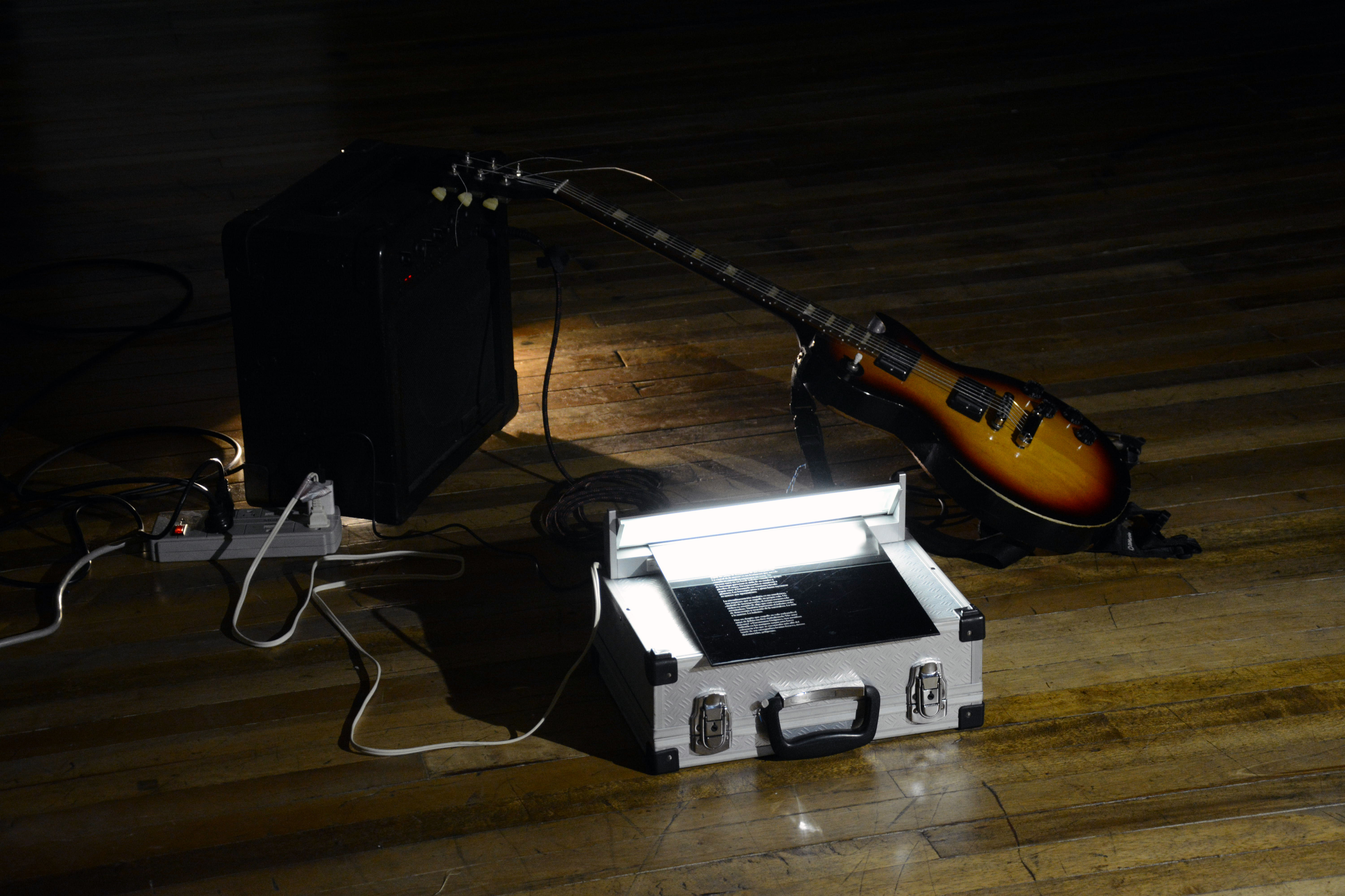 Sound installation. Electrical guitar, guitar amplifier, Axoloti sound microcomputer, light sensor, Etched Acrylic plate, LED lightning.
