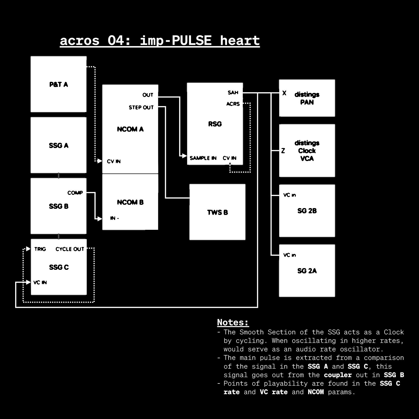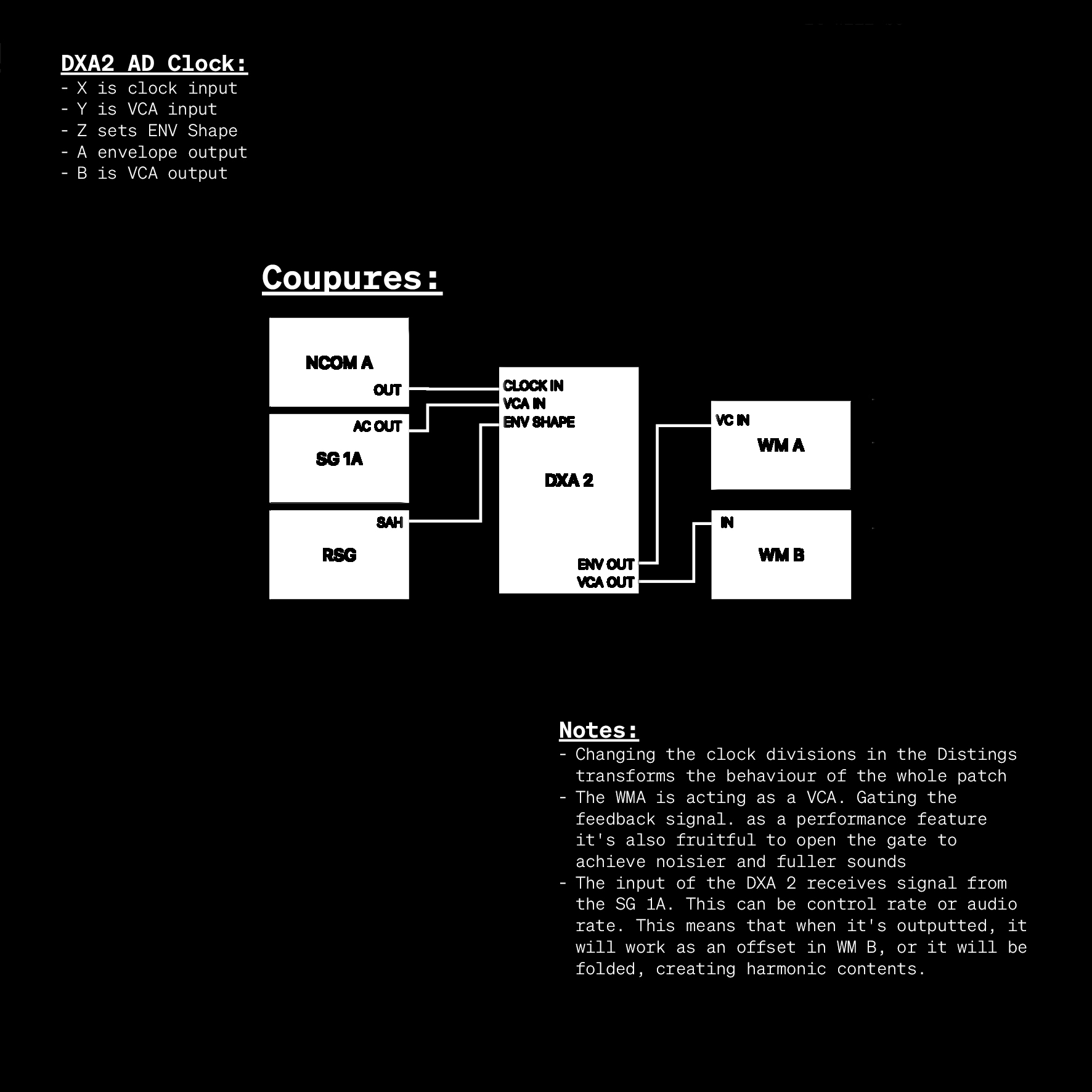 The patch started as a single panel design, focusing on one main demonic synthesis1 cell build around a feedback entanglement between the Wave Multiplier and the Resonant Equalizer modules, and grew bigger and bigger. Instead of making a full representation of the patch, that would be as chaotic as the cables in my synthesizer, I decided to break the patch in parts organized by cells and specific functions.